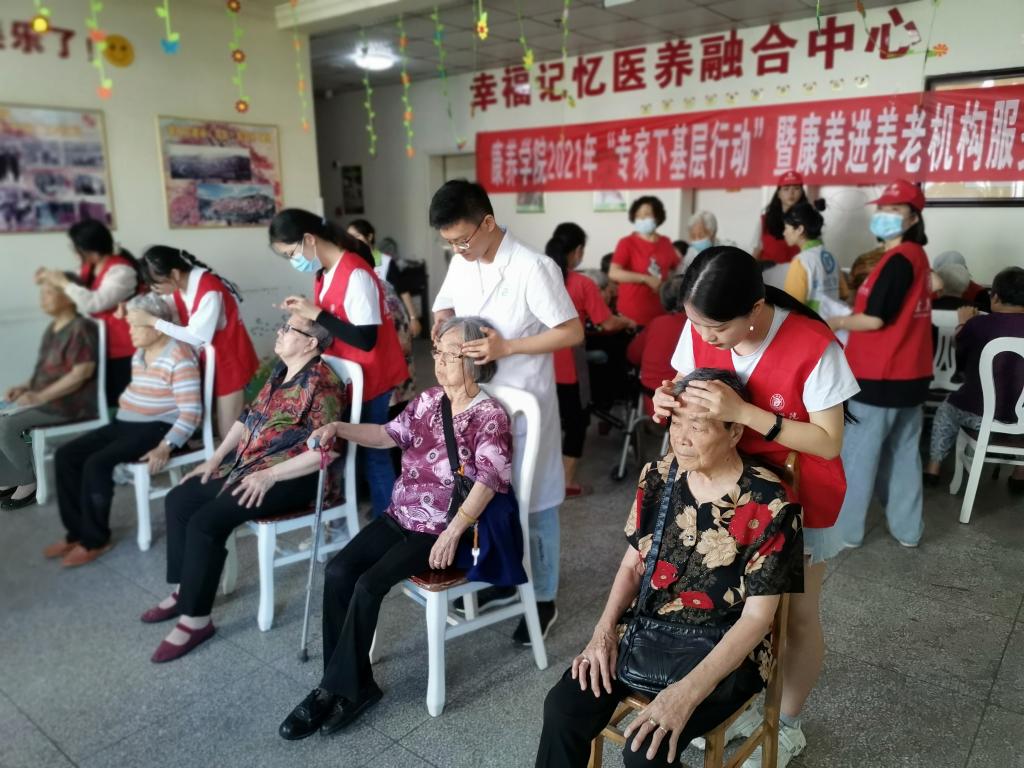 专家团队悉心为院内老人们进行了日常科学养身及康复常识普及、健康咨询和义诊;与院内医护工作者进行了交流互动,并指导养老护理员开展了心肺复苏等现场培训;养护院管理人员围绕高质量做好养老机构服务与管理进行了调研交流,提供了养老机构经营管理咨询服务。同时专家团队指导学生志愿者为老人们进行血压检测、保健艾灸、抚触按摩等活动;学生志愿者为养护院的爷爷奶奶表演了文艺节目,丰富多彩的现场活动受到老人们和养护院工作人员的欢迎。