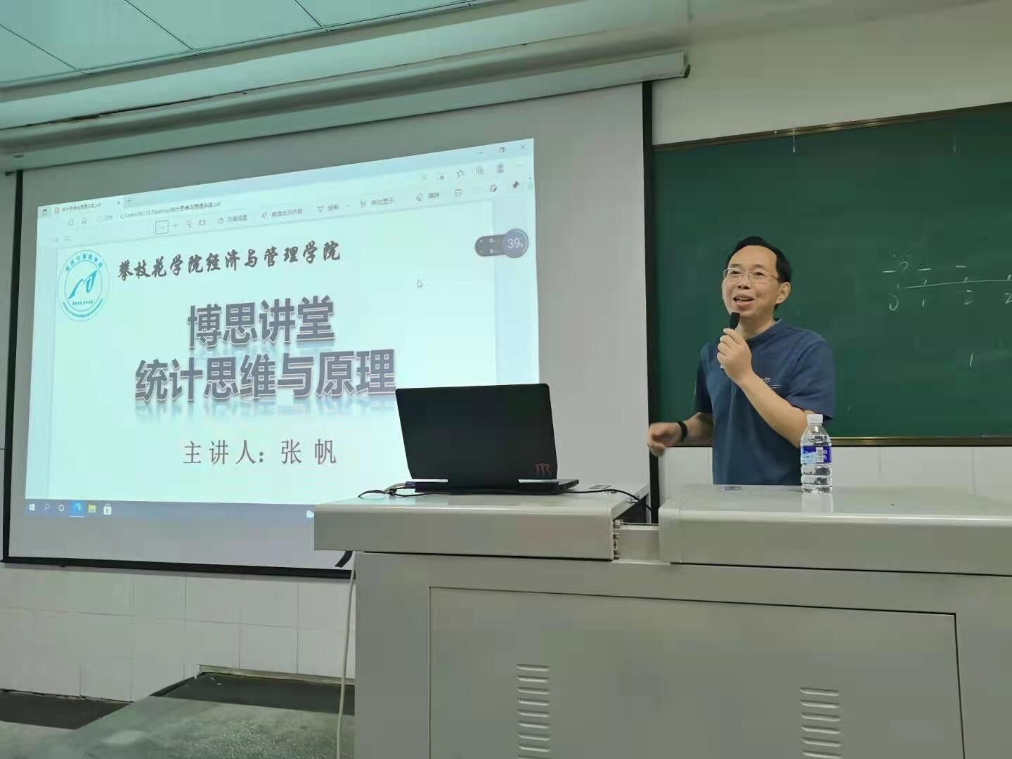 7月5日下午,张帆副教授以《统计思维与原理》为主题和老师们一起探讨什么是统计思维。他从统计学发展历史出发,向老师们介绍了统计学发展历程,并详尽地阐释了统计工作过程、描述性统计和推断性统计。在向老师们分享自己见解的过程中,张帆将统计学中的各种思维完整地串联起来,深化了老师们对于统计思维的认知,有助于老师们构建完整的统计思维模式。