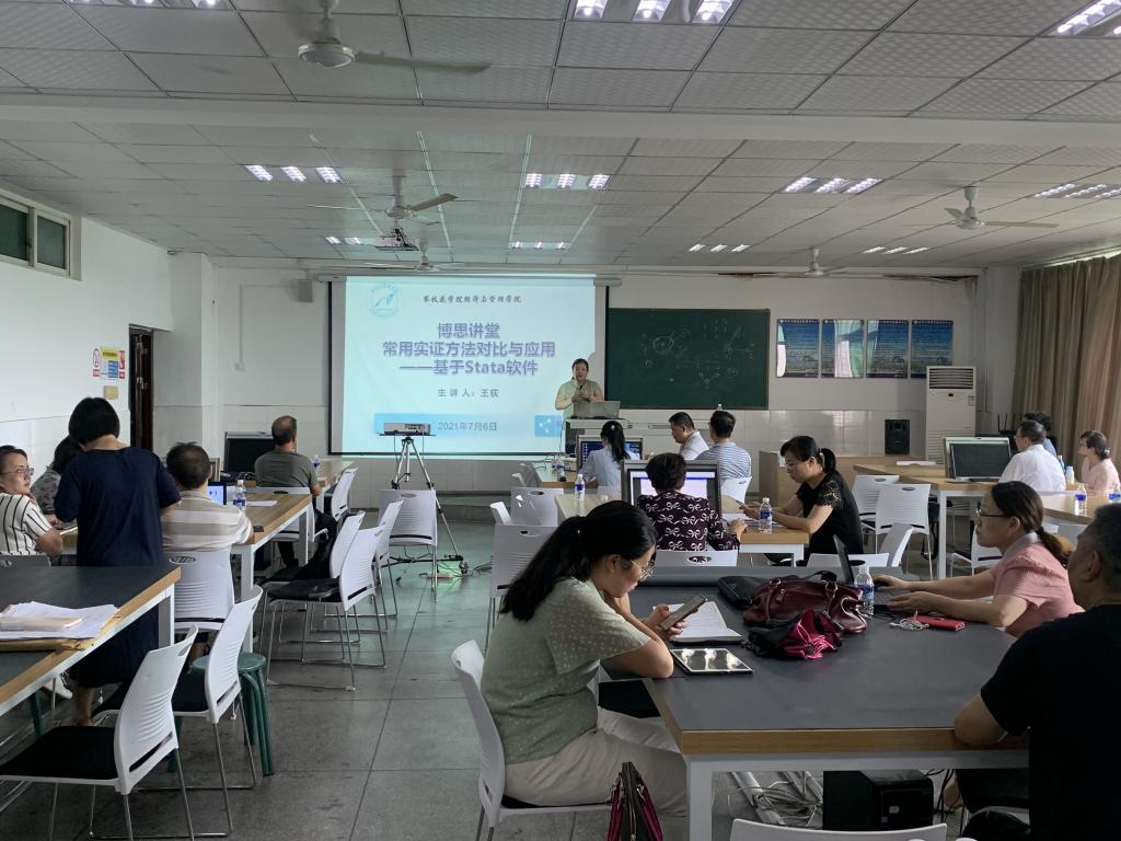 7月5日至7月7日,经济与管理学院举办了“大数据管理与应用”系列学术讲座,旨在增进全院教师对大数据时代的认知与了解,帮助全院教师适应大数据给我们的生活、工作、思维方式和商业模式带来的巨大改变,提升运用Python、R、Stata、SPSS等计算机软件进行财务、生产、营销、贸易、金融等方面的大数据管理与统计分析的能力。本次系列学术讲座共分为五场,邀请学院郝德强、张帆、李杰、王荻和赵冬阳五位老师围绕“大数据管理与应用”这一主题,分别从《基于Python的数据挖掘与多元回归分析》、《统计思维与原理》、《社会网络分析:R语言的应用》、《常用实证方法对比与应用——基于Stata软件》及《SPSS与定量研究》展开分享。