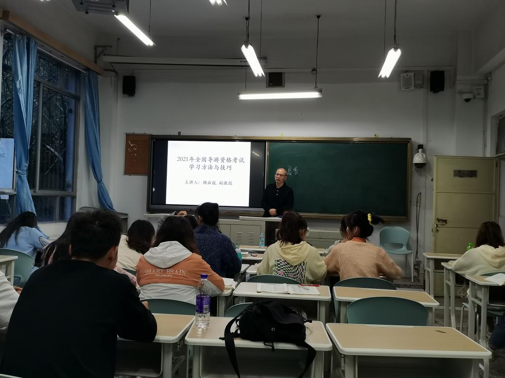全国导游资格考试即将来临,为帮助2020级旅游管专业学生树立信心、更加深入掌握全国导游资格考试知识,备战2021年全国导游资格考试。10月28日,法学院教工党支部书记、旅游教研室主任赖启航副教授开展了《2021年全国导游资格考试学习方法与技巧》讲座。