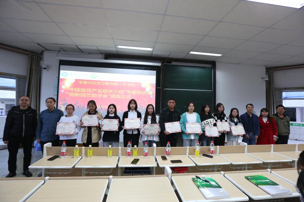 “丽新园艺助学金”旨在为园艺专业经济困难而品学兼优的学生创造更好的学习生活条件,鼓励学生努力学习,以优异的成绩回报社会。学院秉承公平、公正、公开的原则,符合条件的本科二、三年级园艺专业学生通过申报、年级初评、学院复评、公示等程序开展“丽新园艺助学金”评选,最终10名同学入选。此次仪式,不仅让园艺专业的同学们了解到我国盆栽花卉市场现状和发展趋势,也为同学们在本专业开展创新创业指明了方向,激励同学们知恩感恩,努力成长,回馈社会。