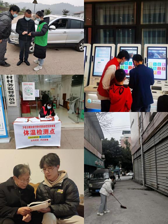 学生志愿者到社区、街道,为家乡人献出自己的一份关爱。为村里小朋友的英语口语发音做指导;帮助街道空巢老人进行家庭卫生清洁;在社区工作站帮助返乡人员进行体温测量、扫描登记,疫情服务工作;和清洁工一起清理街道;带领留守儿童一起阅读绘本……