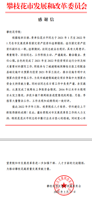 近日,我校收到了市发展和改革委员会写来的感谢信,对我校博士范兴平 2021 年 1 月至 2022 年 1 月在市发展改革委固定资产投资科挂职锻炼工作给予了充分肯定。