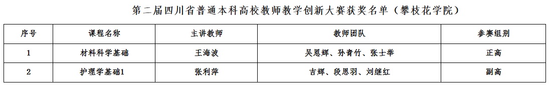 近日,四川省教育厅公布了第二届四川省普通本科高校教师教学创新大赛获奖名单,我校钒钛学院王海波教授及其教学团队荣获正高组三等奖,康养学院张利萍副教授及其教学团队荣获副高组三等奖。