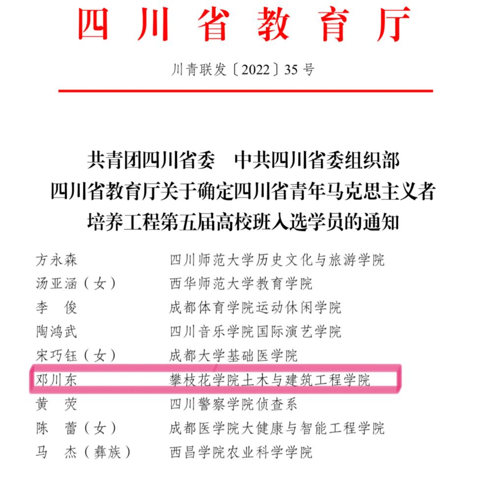近日,共青团四川省委、省委组织部、教育厅联合发布《关于确定四川省青年马克思主义者培养工程第五届高校班入选学员的通知》,经组织推荐、资格审核,我校土木与建筑工程学院2019级工程管理专业邓川东同学成功入选。
