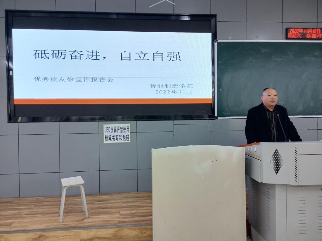 11月12日上午,在我校39周年校庆之际,智能制造学院优秀校友徐世伟重返母校,向在校学生作了精彩的报告。副校长王兵,招生就业处、智能制造学院相关领导出席报告会。