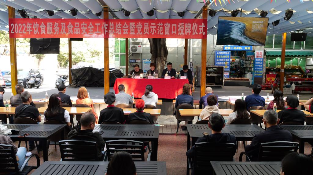 会议对2022年饮食服务及食品安全工作进行了总结表彰,对受到表彰的校园食堂颁发了奖牌,对首批遴选为校园食堂“党员示范服务窗口”的学生一食堂“刚哥小吃”、“烤肉饭”和民族食堂“重庆鸡公煲”进行了现场授牌。