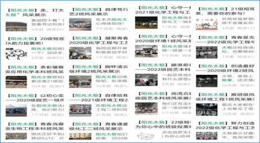 在阳光太极活动期间,学院集思广益,挖掘班级特色,以班级风采系列宣传报道的形式开展网络思政教育。学院激发学生主人翁意识,通过学生喜闻乐见的方式,指导所有班级参与网络文化作品创作,各完成一篇“命题作文”,制作一个网络小视频。21个班级的建设成效、班级理念、自律公约、太极拳练习的感悟体会,以青春的声音宣讲班级风采故事,通过学院微信公众号、学院网站、师生群、家长群等阵地,在师生、校友、家长和社会各层面广泛传播开来。