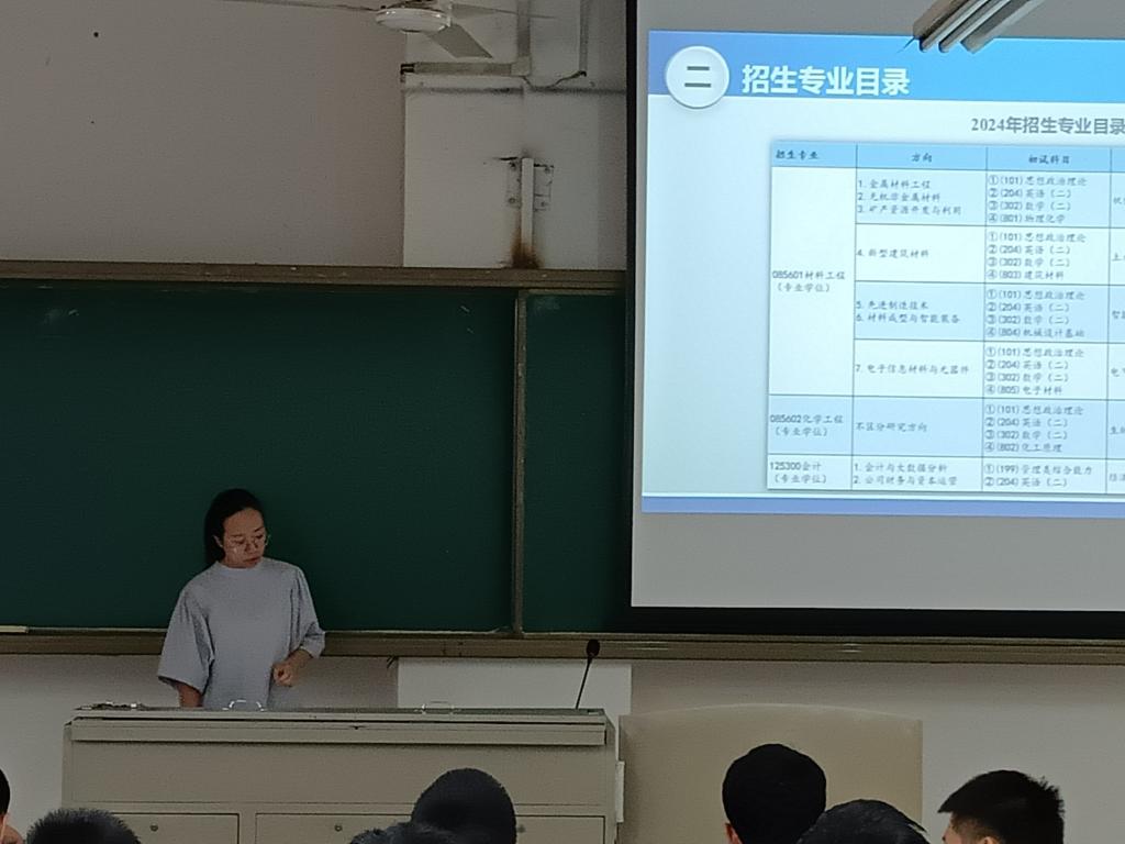 为进一步夯实高层次办学基础、增强学科建设实力,钒钛学院于10月7日组织召开2024年材料与化工专业硕士研究生招生校内宣讲会。会议由副教授张士举主持,学校科研处叶珊、硕士生导师代表以及2024届辅导员等出席宣讲会,应届考研学生80余人参加会议。