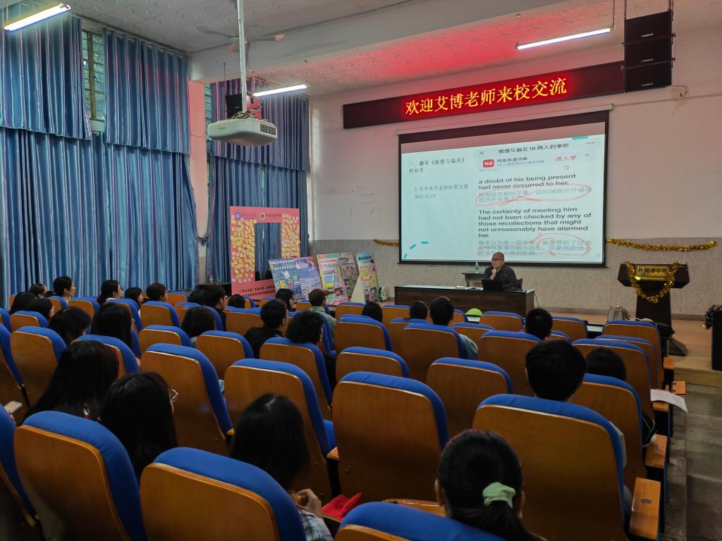 艾博结合自身口、笔头翻译实践经历,针对《傲慢与偏见》的英译过程,以查阅的50多个译本和20多个译注为例,向师生们分享了翻译的重要步骤。翻译前要注重对原作品的理解以及已有翻译的了解;翻译时要对原著的单词、词组、句子、文化背景、上下文、特殊表达、历史演变等多重要素进行理解和翻译,在目标语言的表达上让目标读者尽可能理解原著所要表达的情感、语气、氛围。艾博强调,翻译工作要懂得搜集资料、看各家注解,要谦虚谨慎,看各译者译本,要不断提高翻译每个步骤的技能,要不断提高自己的文学修养。