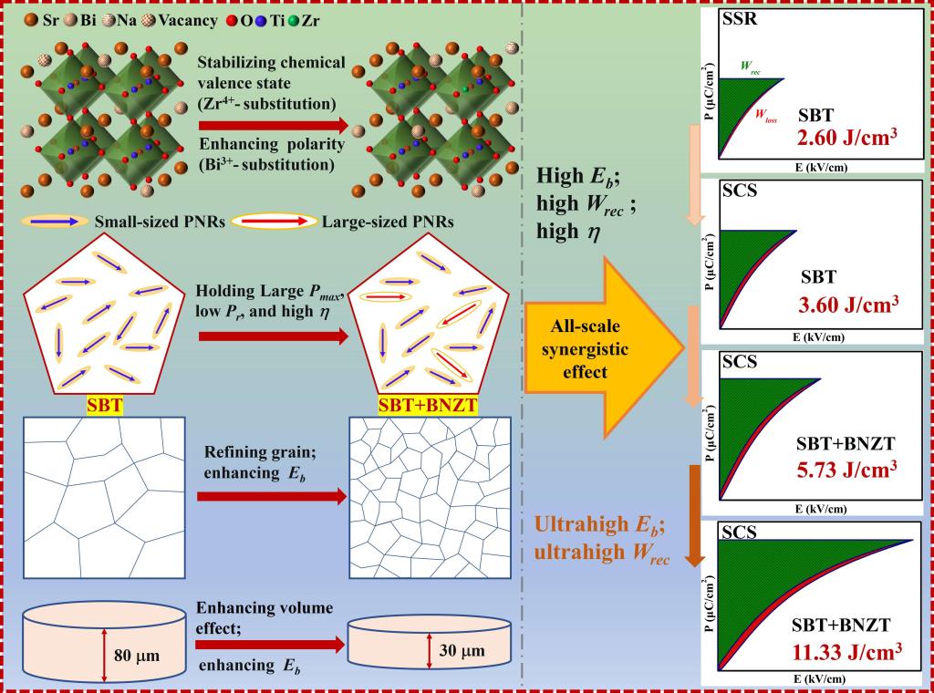 电介质陶瓷电容器较低的能量密度一直是其在先进电子系统中应用的主要挑战。为解决这一问题,该工作创新性地提出利用原子尺度掺杂、纳米畴工程、亚微米晶粒尺寸调节和样品厚度调节等手段,通过全尺度架构来提高SrTiO3基陶瓷的储能性能。与其他单尺度或多尺度设计相比,这种全尺度协同设计实现了卓越的储能性能,首次在SrTiO3基陶瓷中实现超过10 J/cm3的超高能量密度(达到11.33 J/cm3)。这种全尺度架构策略显示出巨大的潜力,为优化电介质电容器的储能性能提供了一种新的途径。