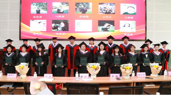 在毕业生授位环节,廖红为外国语学院7位毕业生代表授位并与学生及家长合影留念。授位导师依次为参加现场授位的毕业生授位。