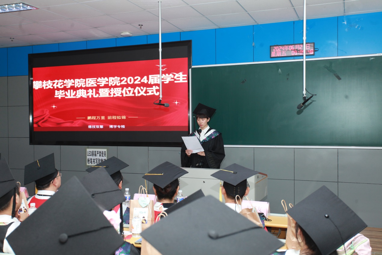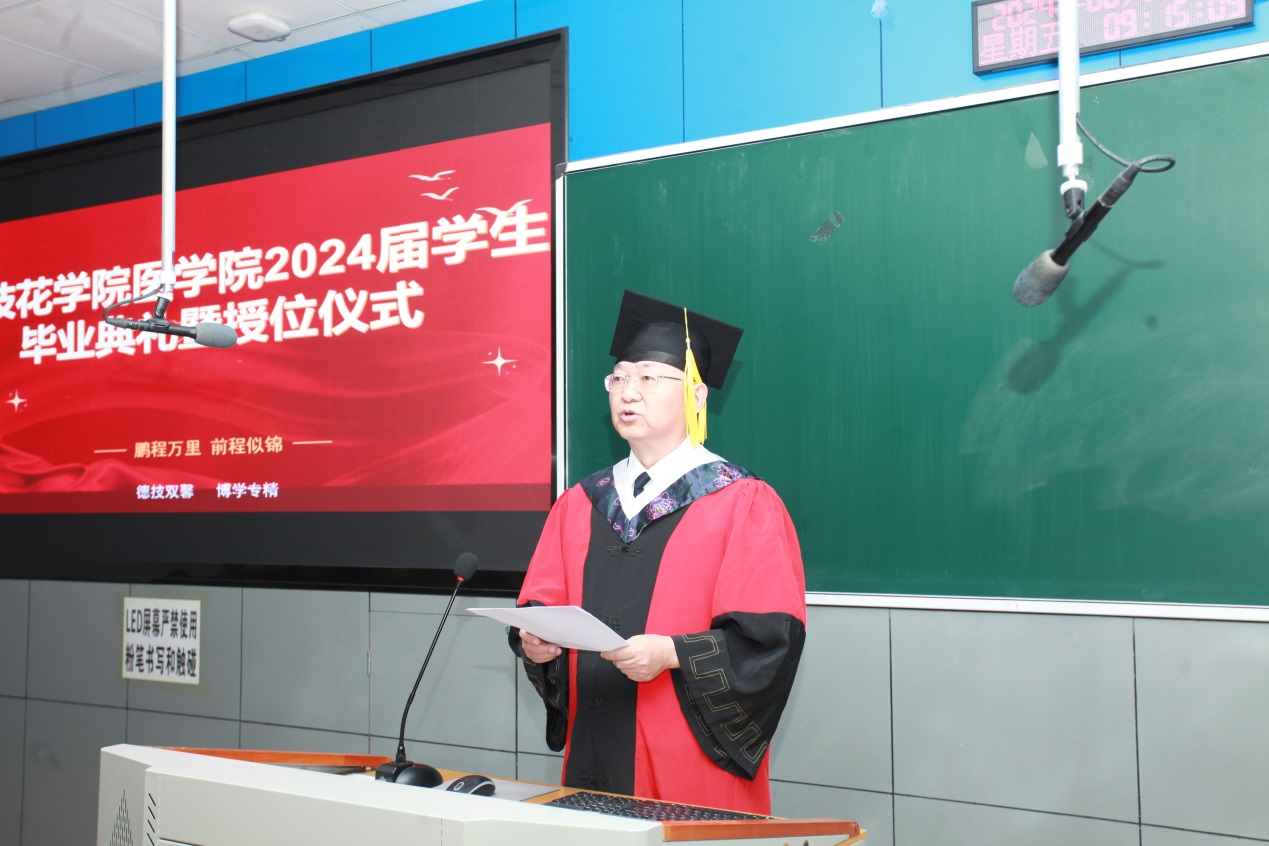 典礼上,教师代表李汇明寄语毕业生,要谨记校训“明德砺志博学笃行”以及医学院“德技双馨博学专精”的理念,结合实践,自我学习,以更加扎实的专业能力造福社会。