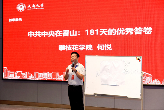 教学展示环节中,来自绵阳师范学院、西南财经大学、成都理工大学、西南财经大学天府学院、四海资讯红足、西南交通大学等6所本科的老师分别进行教学展示,我校何悦老师以“中共中央在香山——181天的优秀答卷”为题进行展示,坚持内容为王,论从史出、史论结合,获得专家和老师们的一致好评,荣获特等奖!