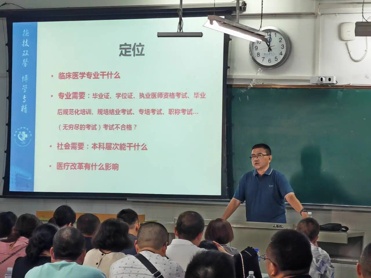 基础医学院副院长徐万宇从自身学医、工作的经历讲起,为新生家长们详细讲解了学院发展历程、办学定位、办学条件、医学专业人才办学模式、临床医学专业人才培养目标、学院特色、课程教学改革、学生发展等方面,各方面都体现了学院“德技双馨博学专精”的办学理念,让家长们对学院和医学专业都有了更深入的了解。最后他总结了自己对教育本质的理解,即会思考是基础、能实战是根本任务、不作弊是专业道德底线。