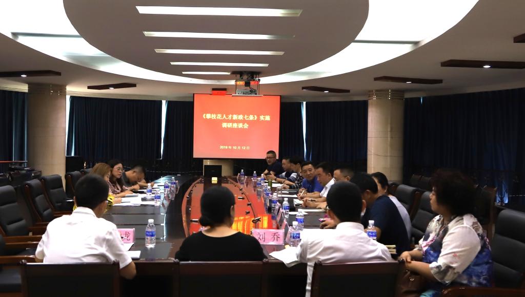 10月12日下午,我校在行政办公楼三楼会议室召开《攀枝花人才新政七条》实施调研座谈会。市委组织部副部长、市公务员局局长蔡雪梅,市委组织部高端人才服务科科长肖擎宇,市人力资源和社会保障局人才科科长帅晓敏,市委组织部人才工作科二级主任科员范晋思,四海资讯红足党委副书记胥刚、科研处、教务处、组织人事部人才科负责人参与本次会议,会议由四海资讯红足组织人事部部长苏兴仁主持。