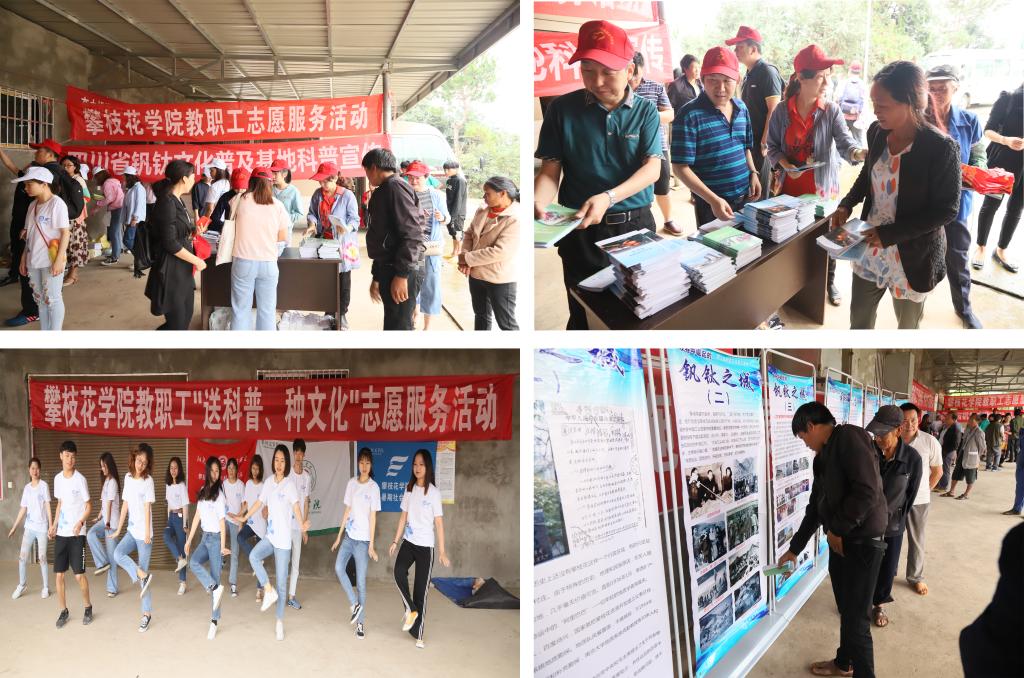 志愿者通过资料发放、展板宣传、现场咨询等方式,为当地民众送去了钒钛科普知识、种植技术资料、食品安全常识,针对具体问题还进行了仔细讲解;志愿者进行了急救知识讲解和急救演示,并手把手教村民具体操作;志愿者带去了歌曲、舞蹈、朗诵、葫芦丝独奏等文艺表演。期间,部分教职工还走访慰问了结对帮扶贫困户,并送去了帮扶资金。