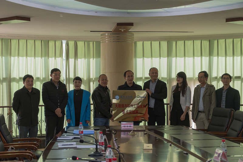 唐雪飞介绍了此次捐助活动的目的与意义,并代表公司捐赠6套总价值为500万元的软件用于我校人才培养。随后,双方对校企合作建设的大数据与软件工程重点实验室进行了授牌。