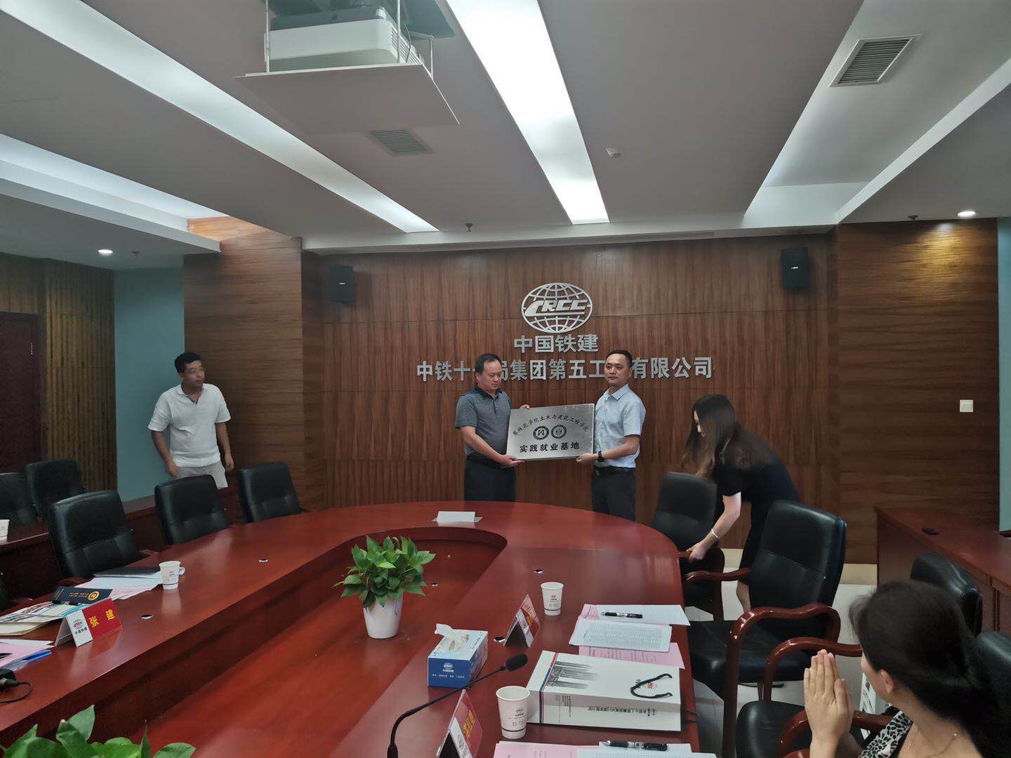 8月17日下午,土建学院院长、党委书记等一行4人到中铁十一局五公司举行了就业实习基地签订仪式。中铁十一局五公司纪委书记姜永胜和相关部门负责人以及校友代表参加了此次座谈会。