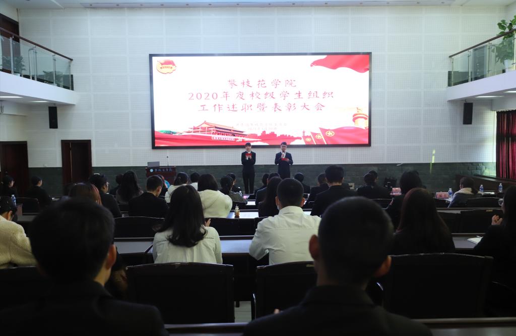 1月10日上午,2020年度校级学生组织工作述职暨表彰大会在图书馆二楼学术报告厅举行。学生处、校团委相关负责人,各校级学生组织指导老师和学生干部代表参会。