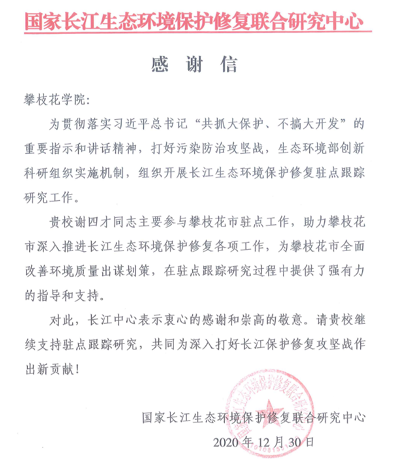 近日,我校收到来自国家长江生态环境保护修复联合研究中心的感谢信,对我校大力支持长江生态保护工作给予高度评价。