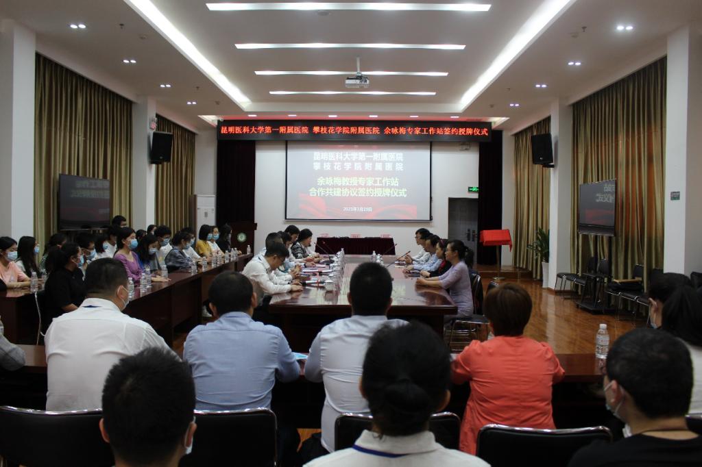 3月19日上午,昆明医科大学第一附属医院耳鼻咽喉科“余咏梅专家工作站”签约授牌仪式在攀大附院举行,标志着又一个专家工作站正式落户我院。攀枝花市卫健委副主任张福鑫、昆医大附一院医务部副主任马宗仁、昆医大附一院耳鼻喉科主任阮标教授、余咏梅教授、昆医大附院医务部杨成老师、昆明市儿童医院副主任医师高映勤教授及攀大附院领导班子、相关科室负责人、部分中层干部参加授牌仪式,仪式由副院长卿丽华主持。