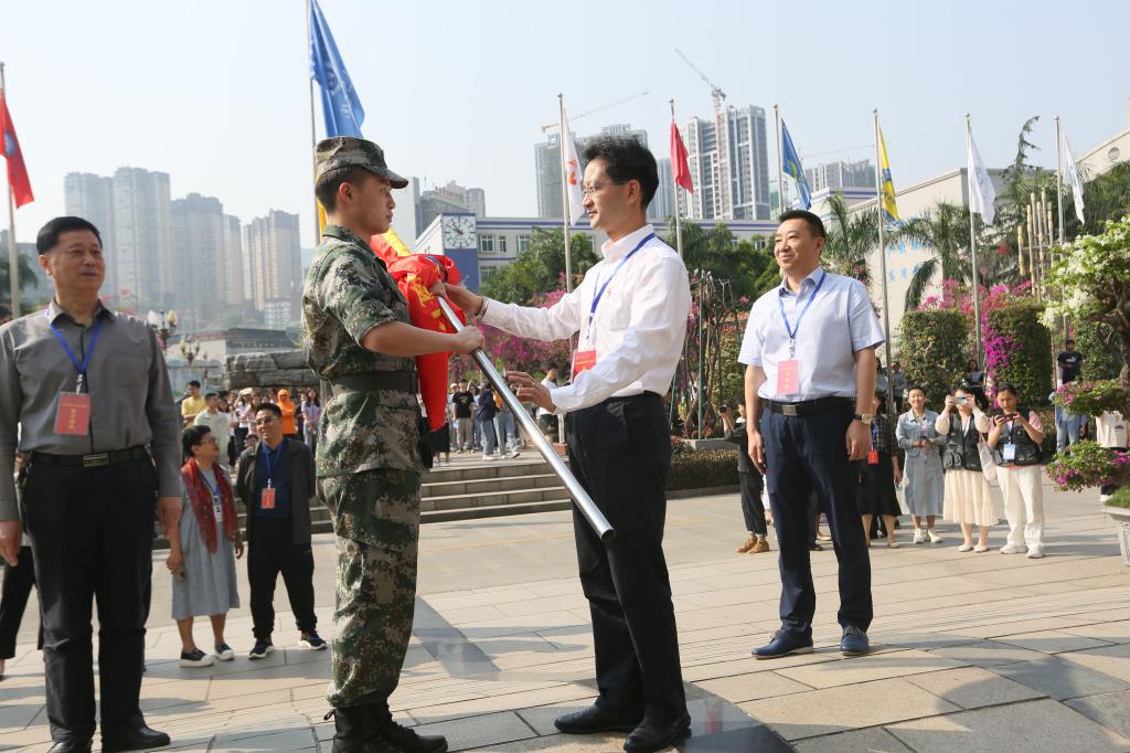 演练结束后,学校党委书记王斌向学生自救互救队授旗。