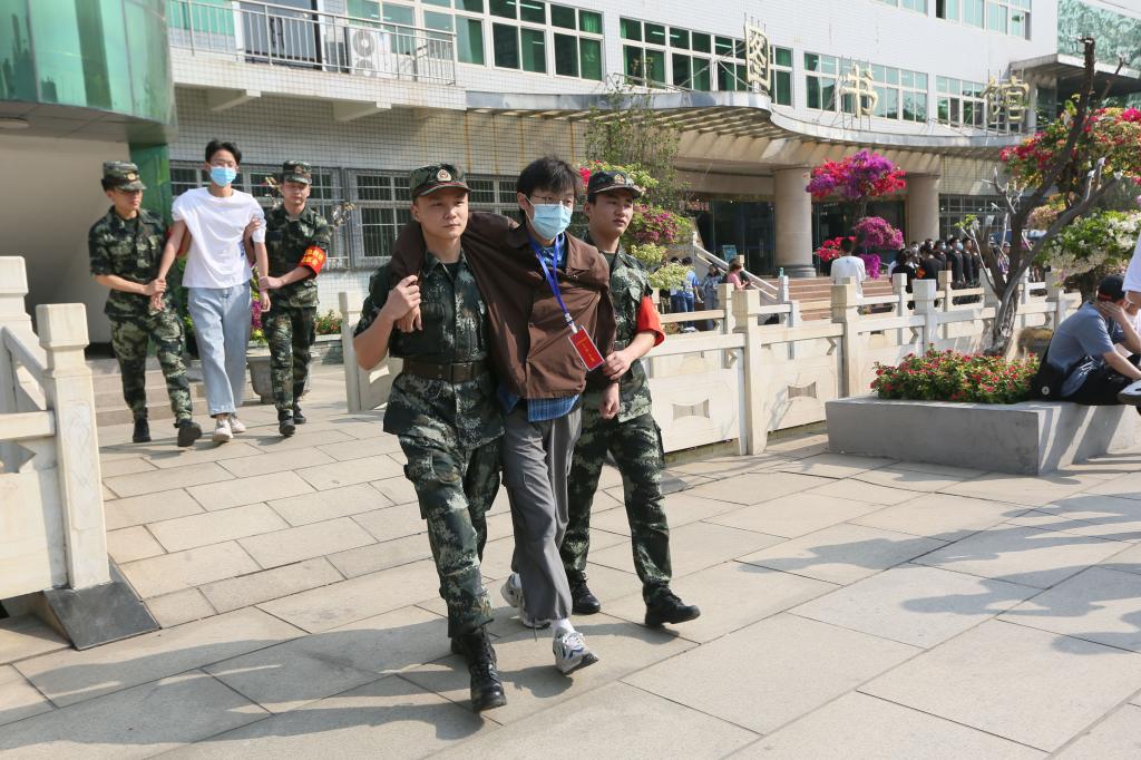 10分钟内,学校学生自救互救队集结完毕,并按照自救预案进行灾情调查和并配合医护人员进行伤员救护。